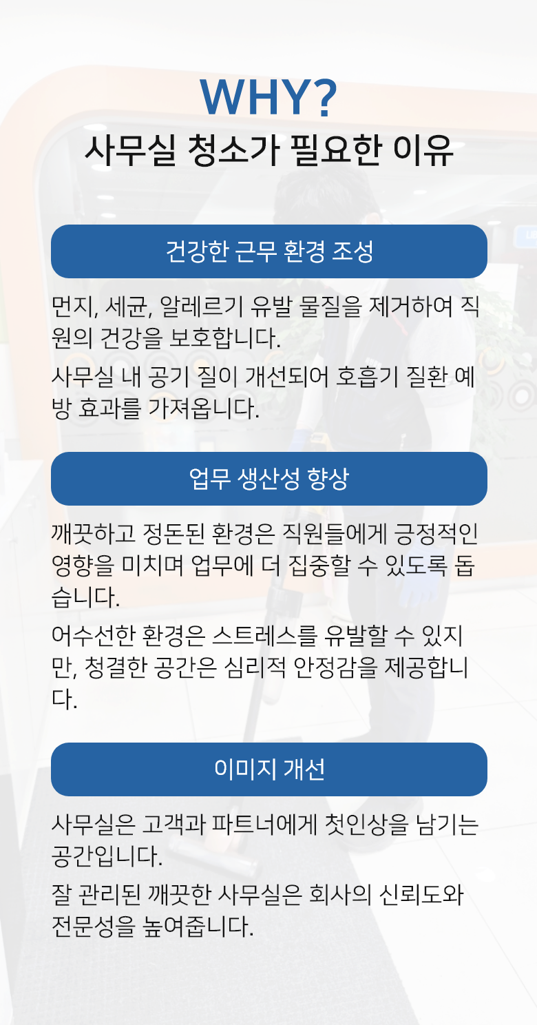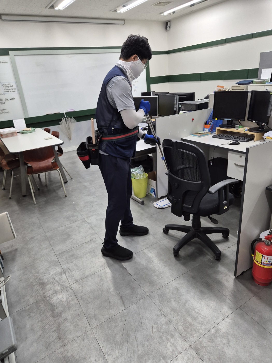 - 사무실 내부의 바닥, 책상, 창문, 공용 공간, 화장실 등 전반적인 청소를 수행합니다.