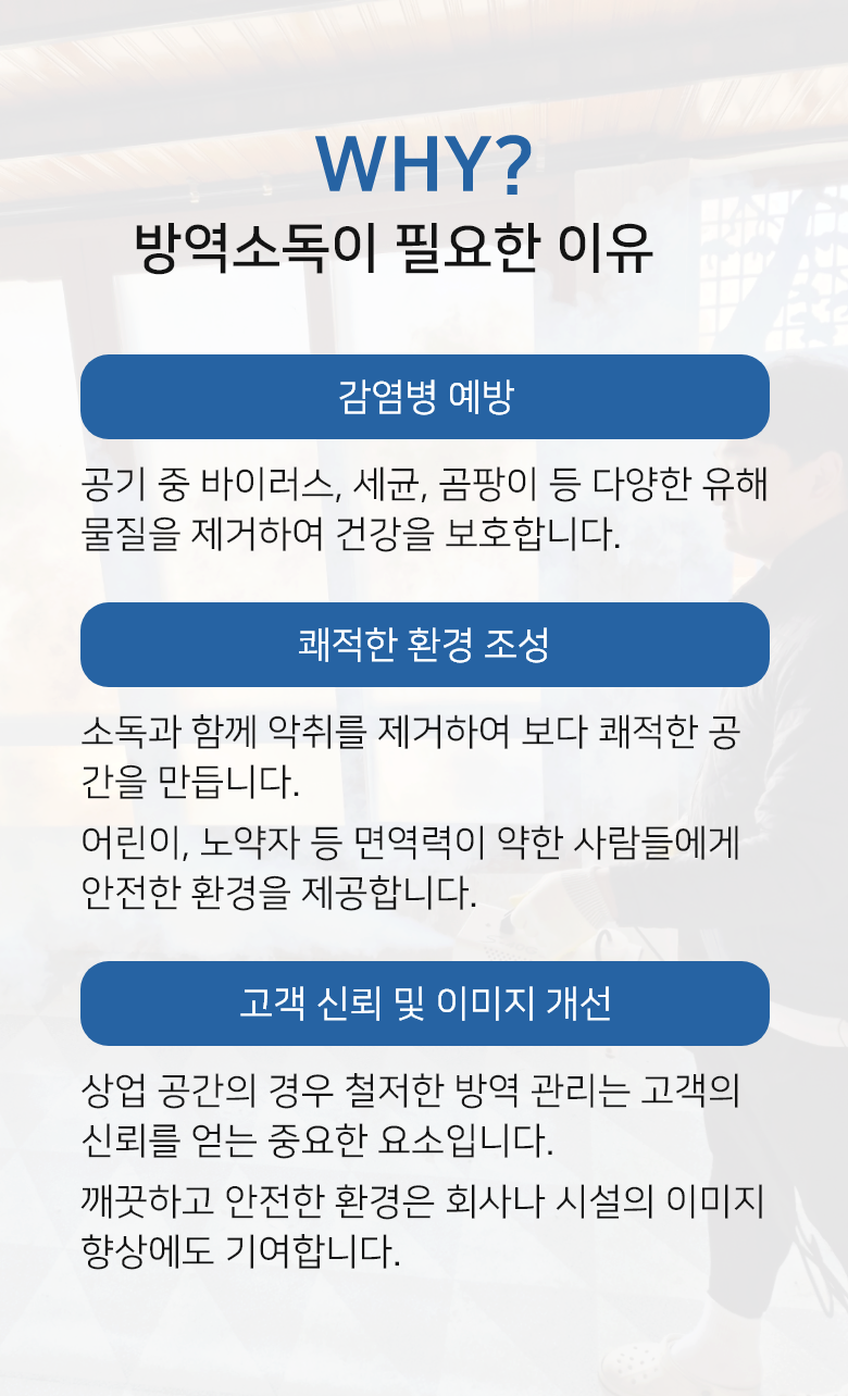 집, 사무실, 학교, 병원, 상가, 공장 등 다양한 공간에 맞는 맞춤형 방역 서비스를 제공합니다.